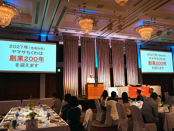 会の初めにまず登壇したのは、ヤマサちくわ株式会社 七代目佐藤元英社長。2028年に創業200年を迎える老舗の歴史を紹介しつつ、「練り製品は日本が誇る伝統食品。だからこそ“練る”という製法にこだわり、本物の味を次の世代に伝えたい」と熱く語りました。