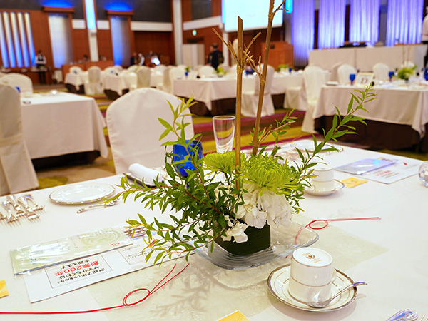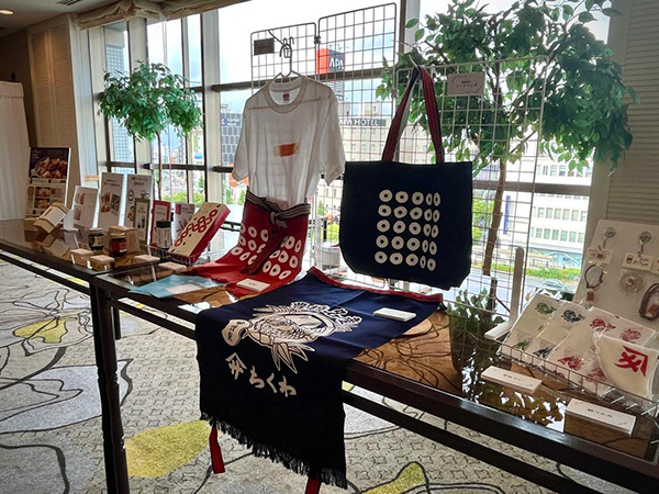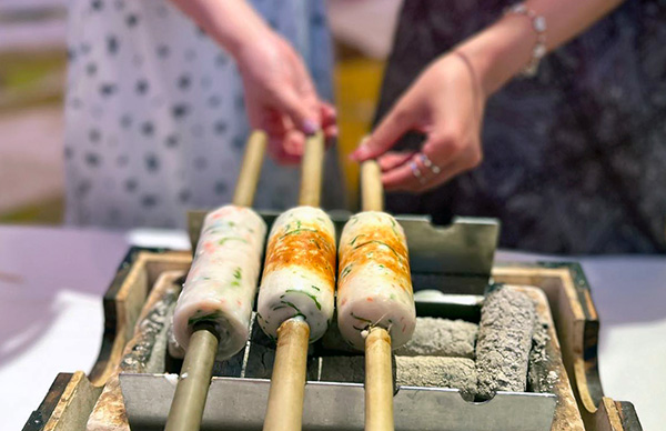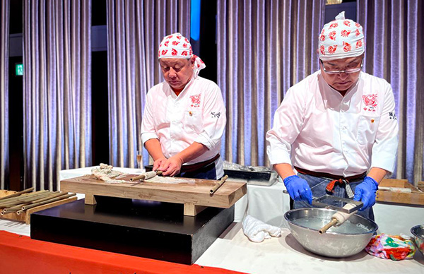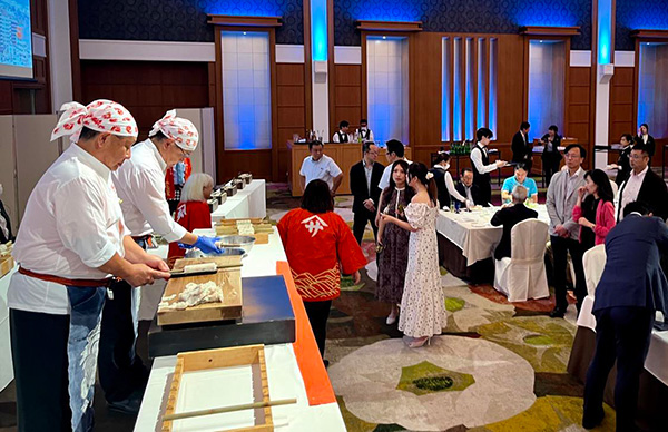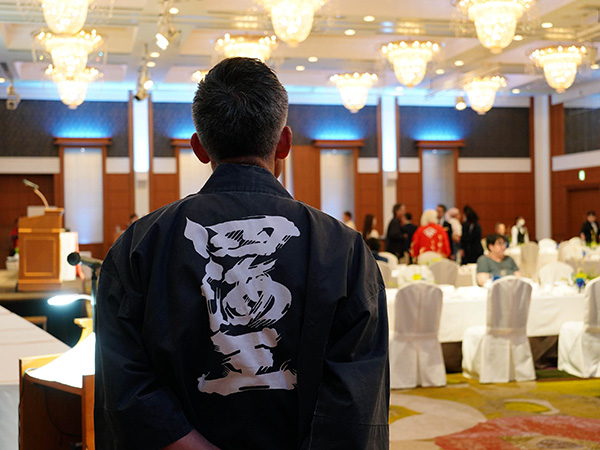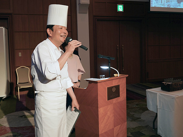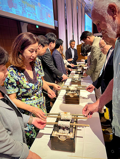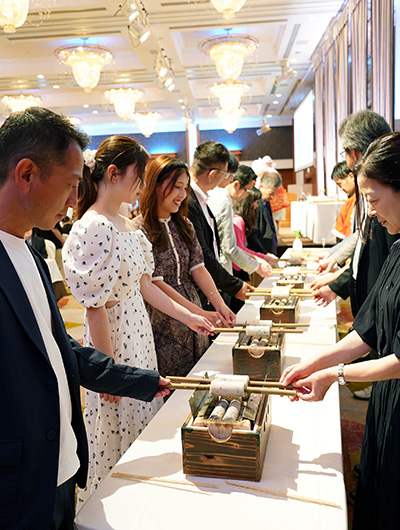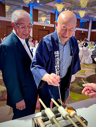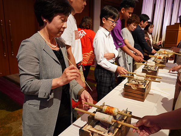 ホテルのボールルームでは初めての試み!「炭火焼きちくわ体験」では、佐藤社長・佐藤副社長の“ちくわブラザース”がその場ですり身を練って、鮮やかな手つきで竹に巻きつけ、ゲストの皆さん自ら炭火で焼き上げていただきました。ちくわをくるくる回しながらワイワイ、食べるだけではなく“作る楽しさ”を共有できる貴重な時間となりました。