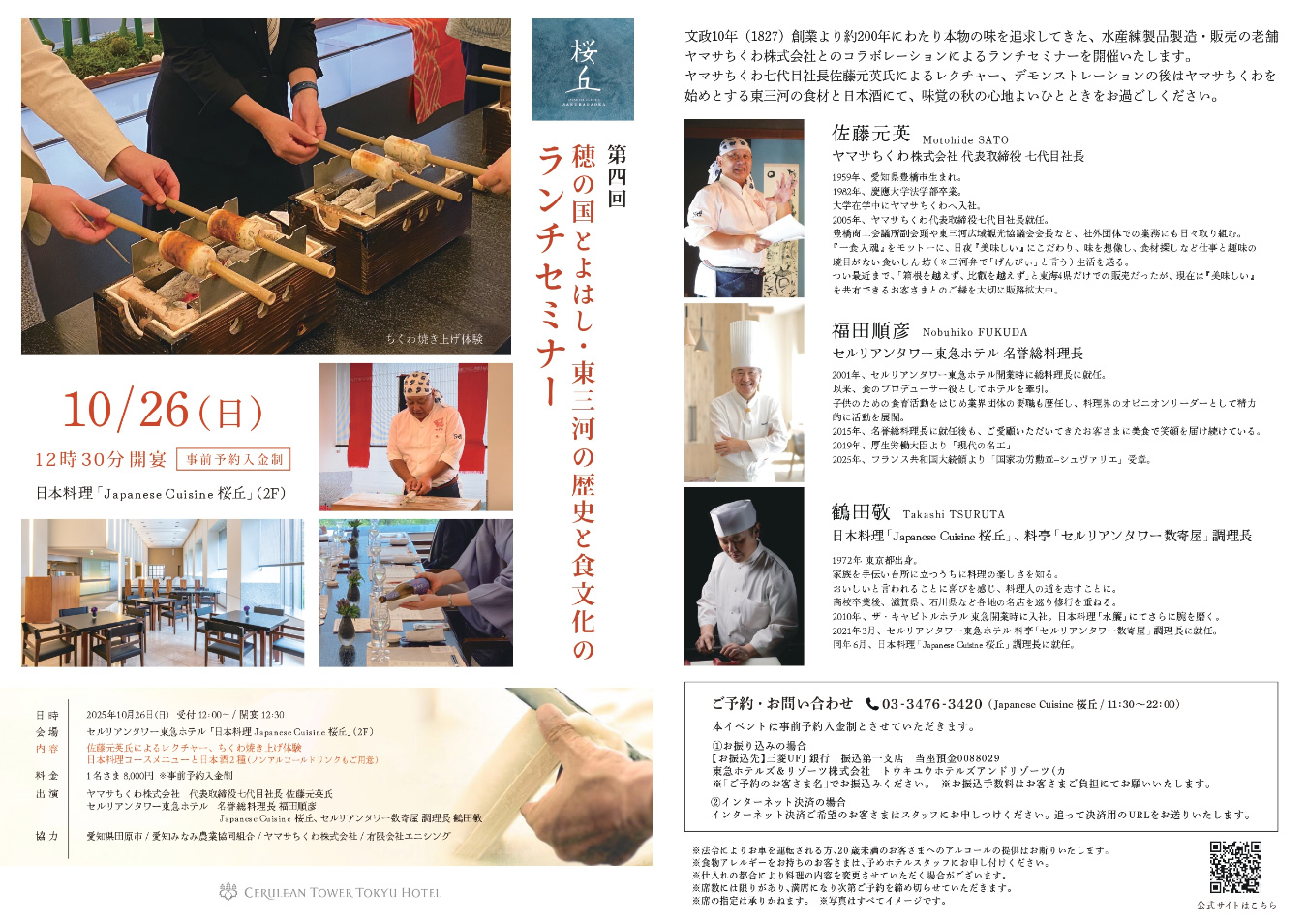 当日は、豊橋を代表する老舗企業 ヤマサちくわ株式会社 七代目 佐藤元英社長、そして 福井酒造株式会社 五代目福井智裕社長が登壇。素材と製法にこだわった“ものづくり秘話”に学び、地元食材を活かした料理や銘酒をあますところなく堪能した一夜でした。
