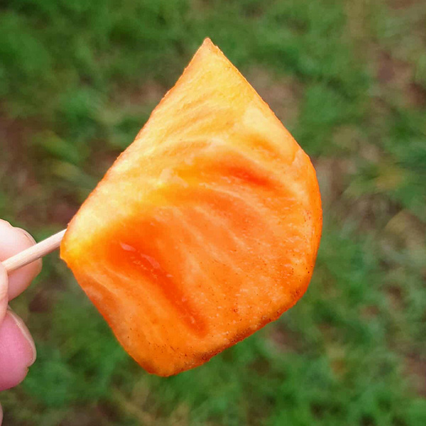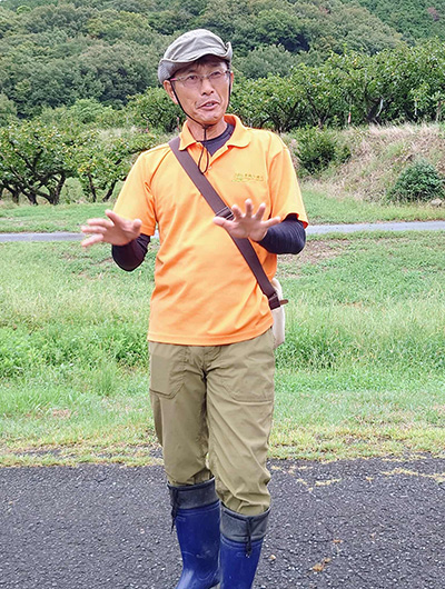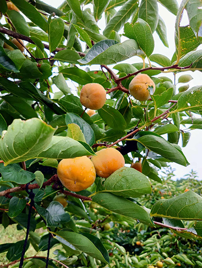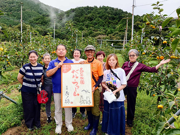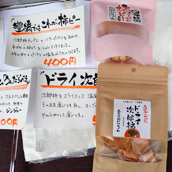 姫街道を進み、気賀の関所や三ヶ日みかん畑を通り抜けて、豊橋市へ。石巻地区に広がる『百年柿園 ベル・ファーム』を訪問しました。5代目の鈴木義弘さんから、豊橋特産「次郎柿」をはじめ、西村早生や早秋といった様々な柿の栽培方法や特色、日本一の次郎柿産地としての誕生秘話についてなどをお聞きしました。さらに、3種類の柿の食べ比べという贅沢な体験も!それぞれに個性豊かな味わいを堪能できました。
