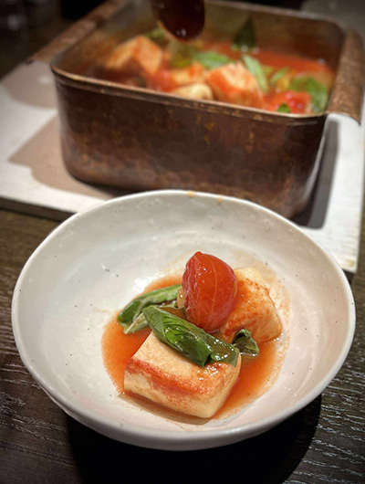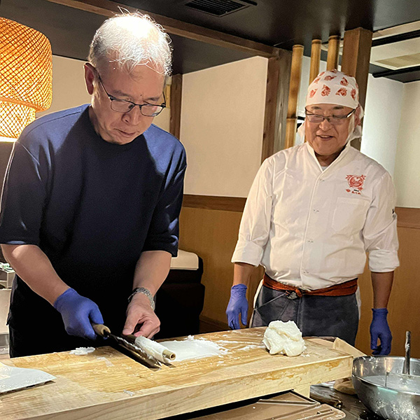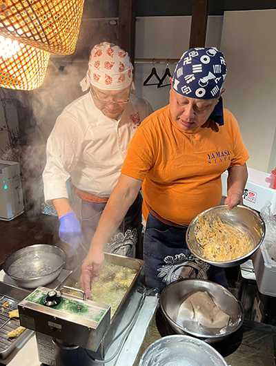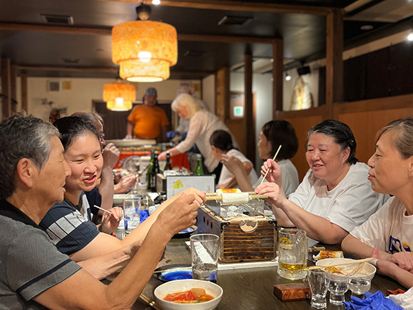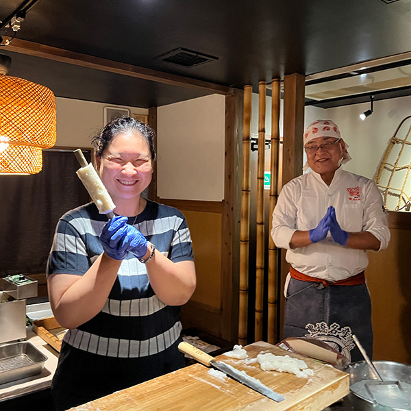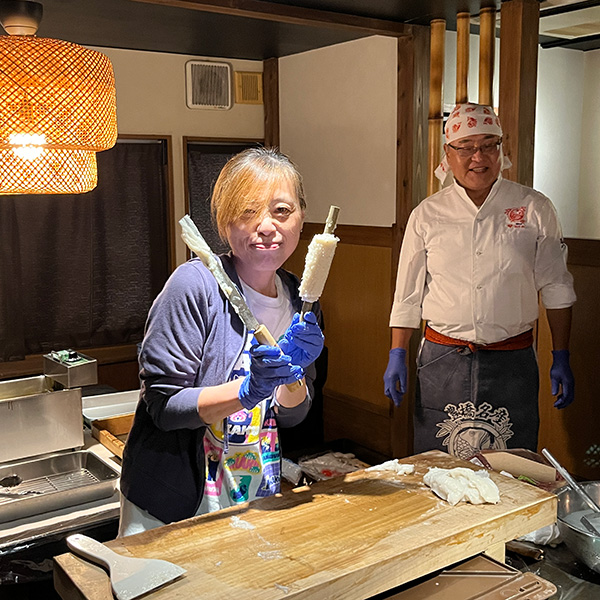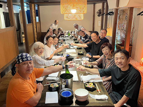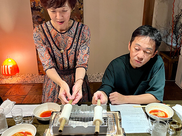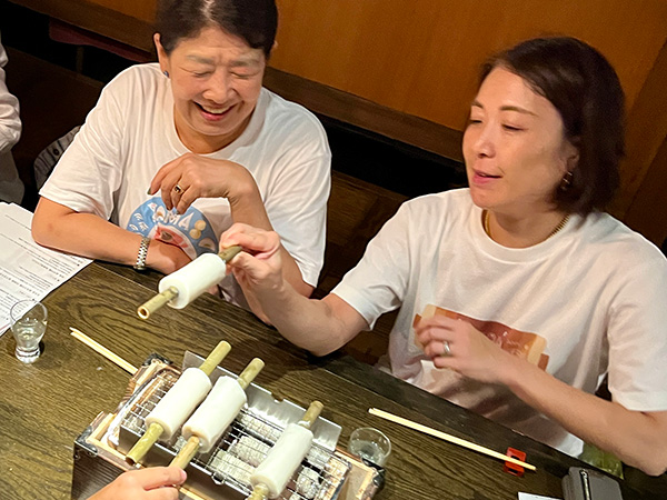 ホテルで一休みして、夜は『ヤマサちくわ直営店 広小路でんでん』にて、七代目佐藤社長自らがおもてなしという特別な宴席です。旬の酒肴、「お座敷天ぷら」の揚げたて、おなじみすり身の手巻きによる“焼きたて”ちくわを味わう炭火焼体験に、福島県南会津郡只見町のトマトを使ったおでんなど、ワイワイと楽しみながら杯を交わし、交流を深めました。