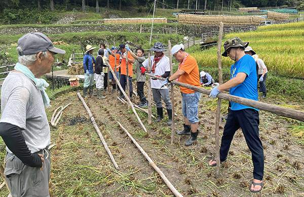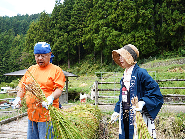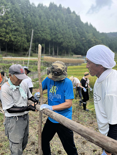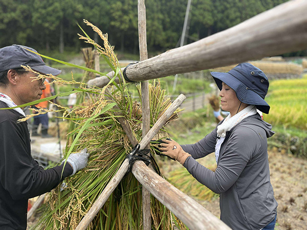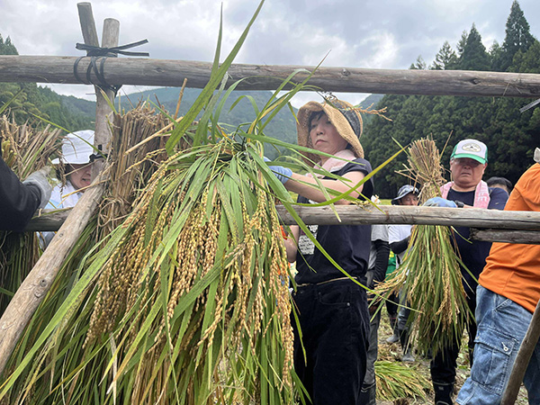 手刈りで稲を刈り取っていくのですが、5株ごとに縄で縛るのにはコツがいります。保存会の皆さんに手ほどきを受けつつ、スムーズなペースで進みました。皆で協力して「ハザ掛け」の木組みも初体験。こうして稲を掛けて自然に乾燥させることで、お米の美味しさがさらに増すそうです。
