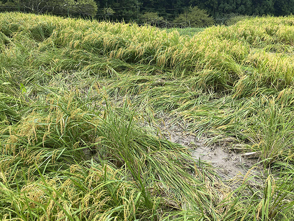近年は獣害に日々悩まされているそうで、借りている田んぼにもイノシシが入ってしまい、収量が減ってしまったと、お世話くださる『鞍掛山麓千枚田保存会』小山舜二会長が悲痛な面持ちでお話しくださいました。イノシシが体を転がしたところの稲が倒され、大きな穴に。稲に獣臭が残ってしまい、収穫できなくなるそうです。