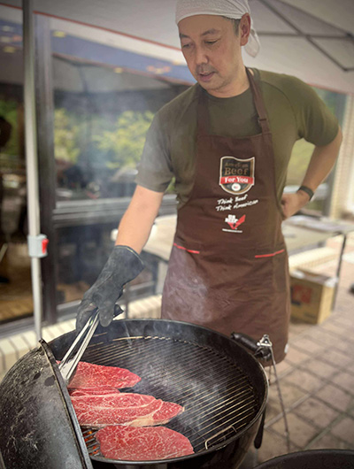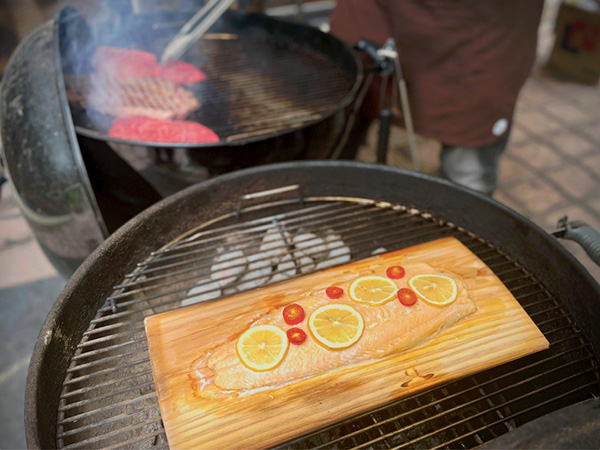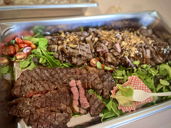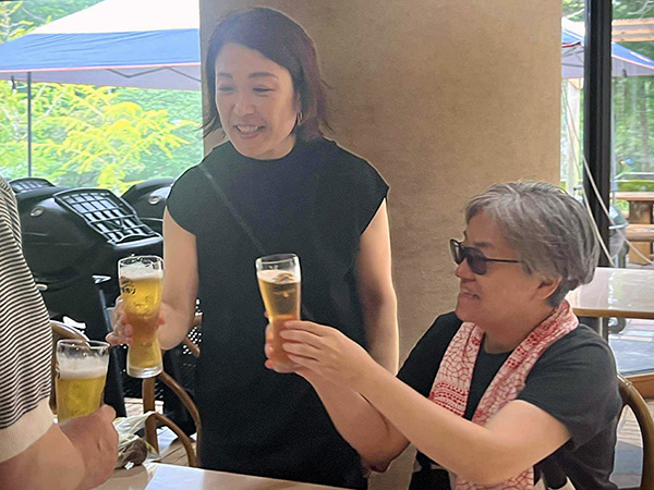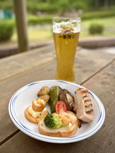 おつかれさま!のビールを片手に乾杯!疲れも吹き飛びます。鹿、鴨など奥三河のジビエ、「錦爽鶏(きんそうどり)」「段戸牛(だんどぎゅう)」といった東三河・奥三河のブランド肉など、バラエティ豊かなメニューをバイキングスタイルで贅沢に堪能。藤田さんからガスコンロでの調理と炭火でのバーベキューとの違いを手ほどきいただき、皆大満足、大満腹でした。