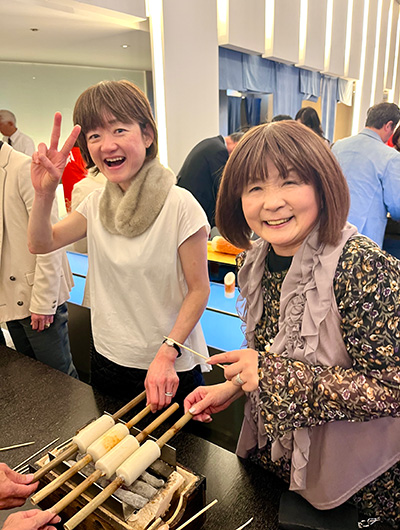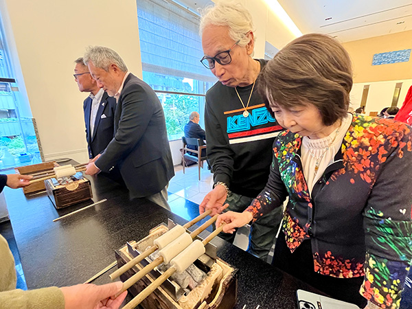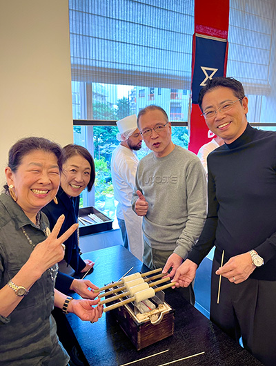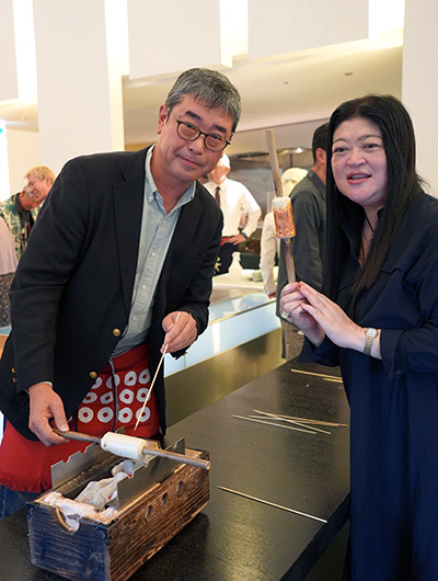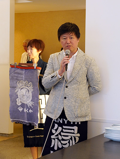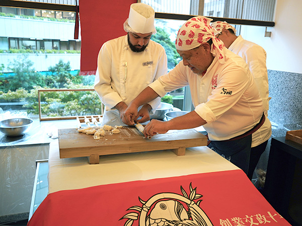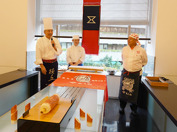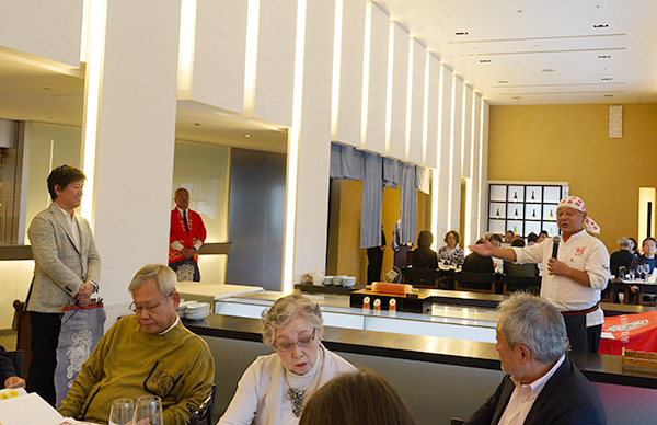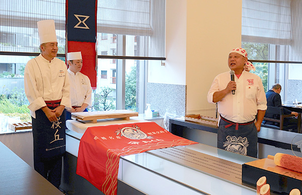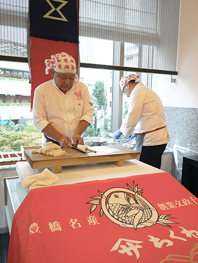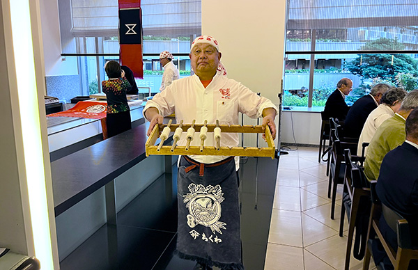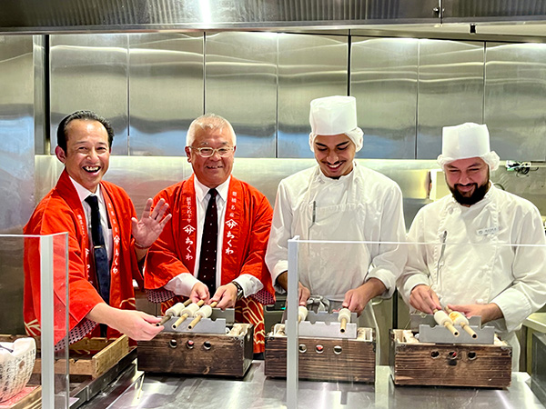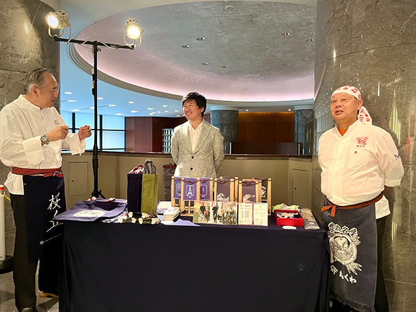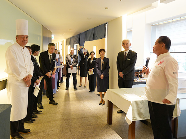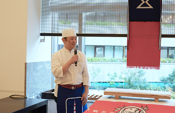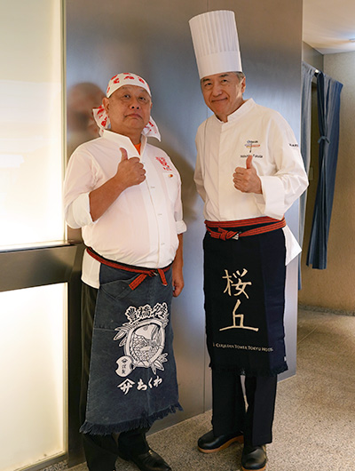 この日は、佐藤社長をはじめ、福田順彦名誉総料理長と桜丘の鶴田敬調理長、東急ホテルのスタッフの皆さんもオリジナルの帆前掛けをキリリと締め、職人の魂を継承するスタイルでおもてなしを行いました。