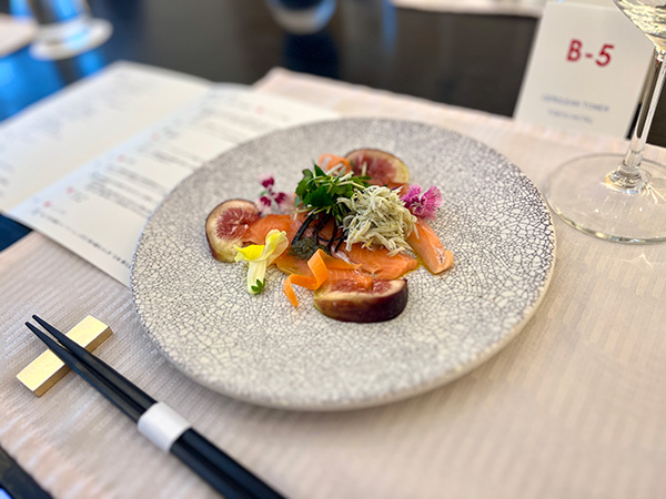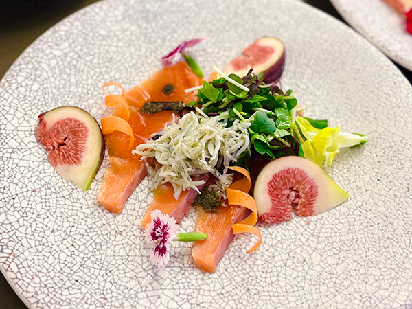 | 【先付】 | *渥美プレミアムラスサーモン/*無花果/*しらす/○エディブルフラワー *大葉ピュレ(彩農園TAHARA DIP SHISO)/香味野菜/塩昆布 |