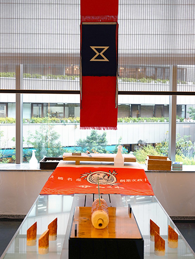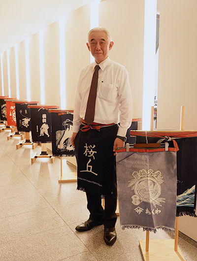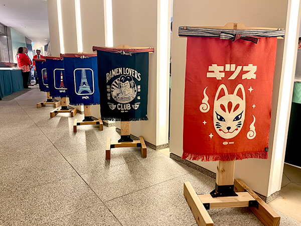 会場入り口でお客様をお出迎えしたのは、豊橋の伝統産業である「帆前掛け」です。『前掛け専門店Anything(エニシング)』代表・西村和弘氏のご協力により、今回は浮世絵シリーズやフランス作家シリーズなど、アートな前掛けが会場に華を添えました。