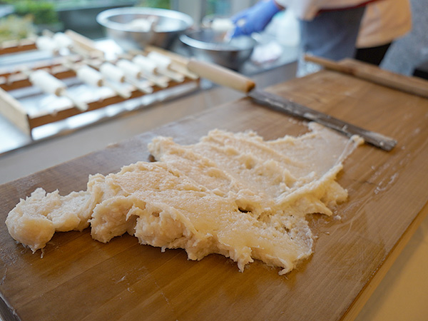 「魚の身を水で洗うことで、生臭さや脂肪分、そして弾力を阻害する水溶性タンパク質を取り除きます。これを程よい加減で行い、石臼で塩と共に練り上げることで、網目状のタンパク質構造ができあがります。これが、私たちが“アシ”と呼ぶ、快い弾力の正体なのです」