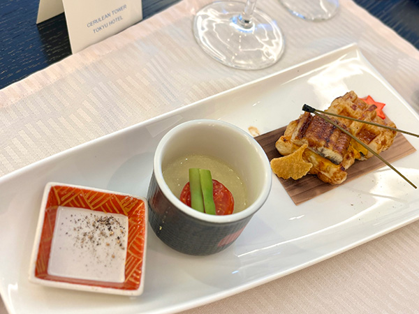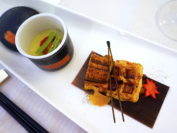 | 【二菜】 | *キャベツのすり流し 豆乳豆腐/隠元/焼ミニトマト/クラタペッパー 〈白ちくわ〉のワッフル *鰻蒲焼き 練り玉/山椒ソース(トリイソース ) |