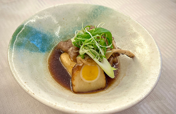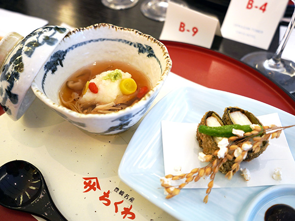 レクチャーの後は、お待ちかねのお料理です。鶴田調理長が田原市の食材とヤマサちくわの製品を見事に融合させた特別献立が登場しました。