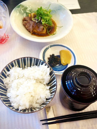 | 【食事】 | 新米釜炊きご飯(愛知県新城市四谷千枚田産ミネアサヒ) *海苔佃煮/*渥美沢庵 *田原牛と松茸のすき煮 〈白はんぺん〉〈うずら巻〉/九条葱 赤出汁 |