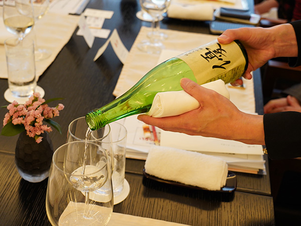 これらのお料理に華を添えたのが、愛知県の2種類の日本酒。ひとつ目は〈田原の銘酒「純米大吟醸 優」〉。スッキリとした辛口で食事を引き立て、香りも楽しめる一杯です。田原市内で契約栽培したお米を100%使い、福井酒造株式会社(豊橋市)で醸造している生まれも育ちも東三河、正真正銘の地酒です。