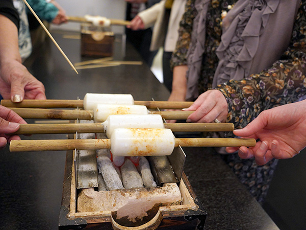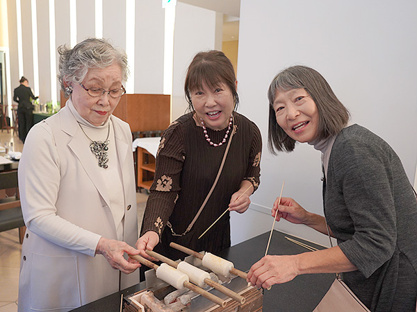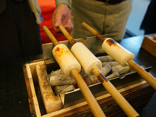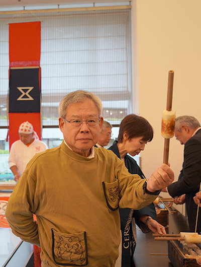 「イトヨリは非常に良い出汁が出るので、余計な調味料はいりません。素材の味を最大限に活かしました」と語りながら、手際よく竹にすり身を巻いていきます。それを参加者の皆様が順次受け取り、炭火の上でくるくると竹を回しながら、焼いていきます。ちくわがお餅のようにぷっくりと膨らみ、香ばしい焦げ目がつく過程を体験。