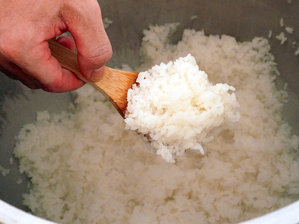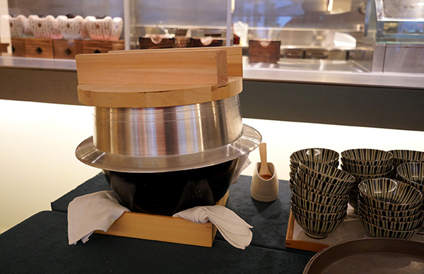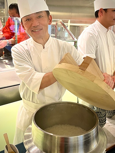宴の結びとして、そしてこの日の最も大切なメインイベントとして提供されたのが、食事の要となる「お米」です。愛知県新城市にある「日本の棚田百選」にも選ばれた『四谷の千枚田』にて、ヤマサちくわ社員やGEN-B参加者はじめ、セルリアンタワー東急ホテルのスタッフも5月の田植えから参加し、9月に稲刈りを行って収穫したという特別なお米。手間ひまかけて天日干し(はざかけ)で乾燥させ、旨味を凝縮させた〈愛知県産ミネアサヒ〉の新米を、大きな羽釜を使って一気に炊き上げました。